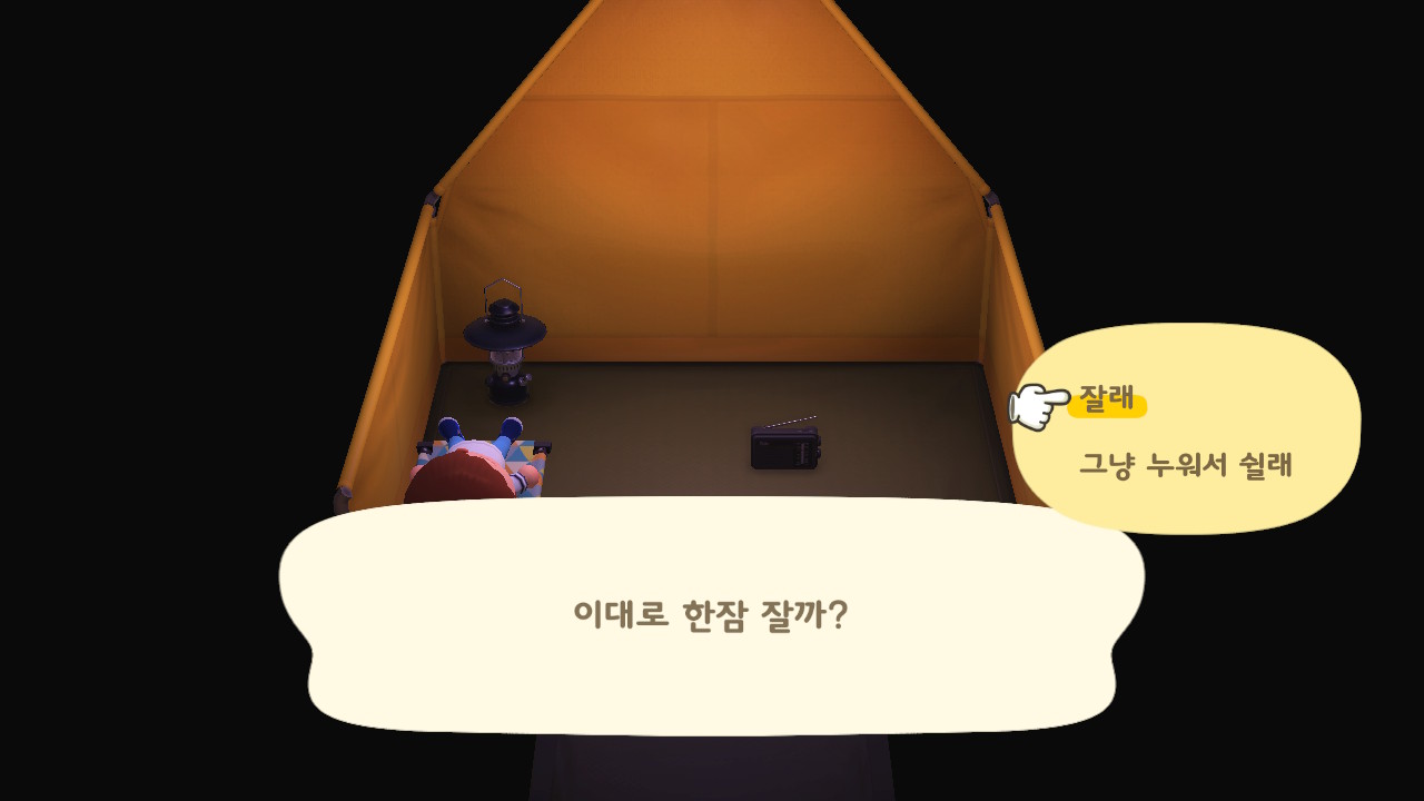 지불을 하는 것을 추천드립니다. 너굴에게 지불하면 텐트 좁지...? 집을 지으면 어때? 하고 물어봐주니 짓겠다고 해주세요.