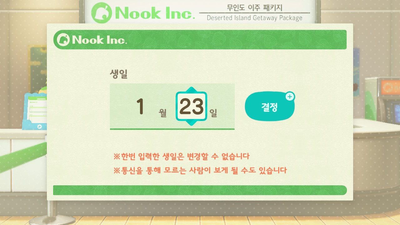 참고로 섬 안에서 생일이 되면 축하 이벤트가 발생하기 때문에, 저는 빨리 확인하고 싶으니 1월 23일로 설정을 합니다...