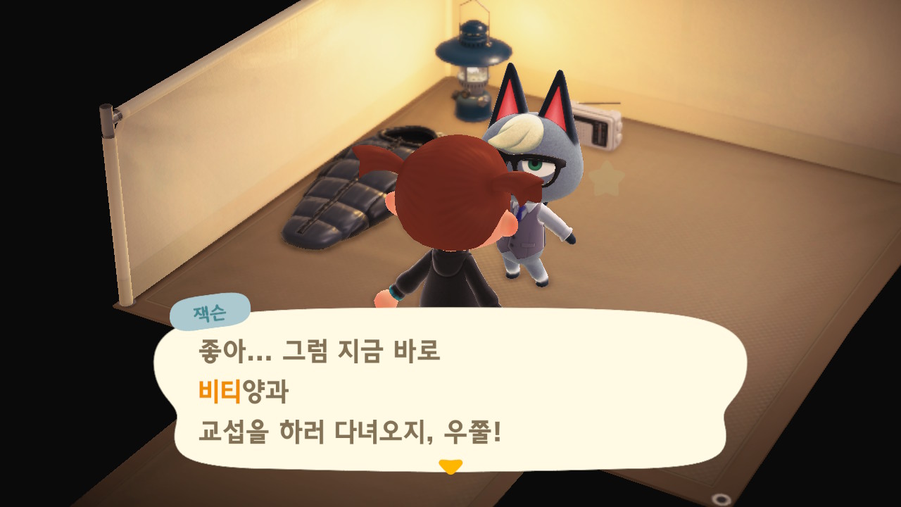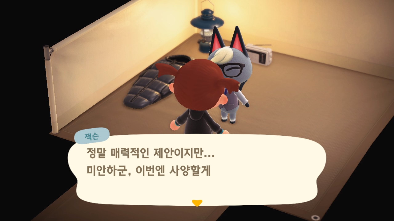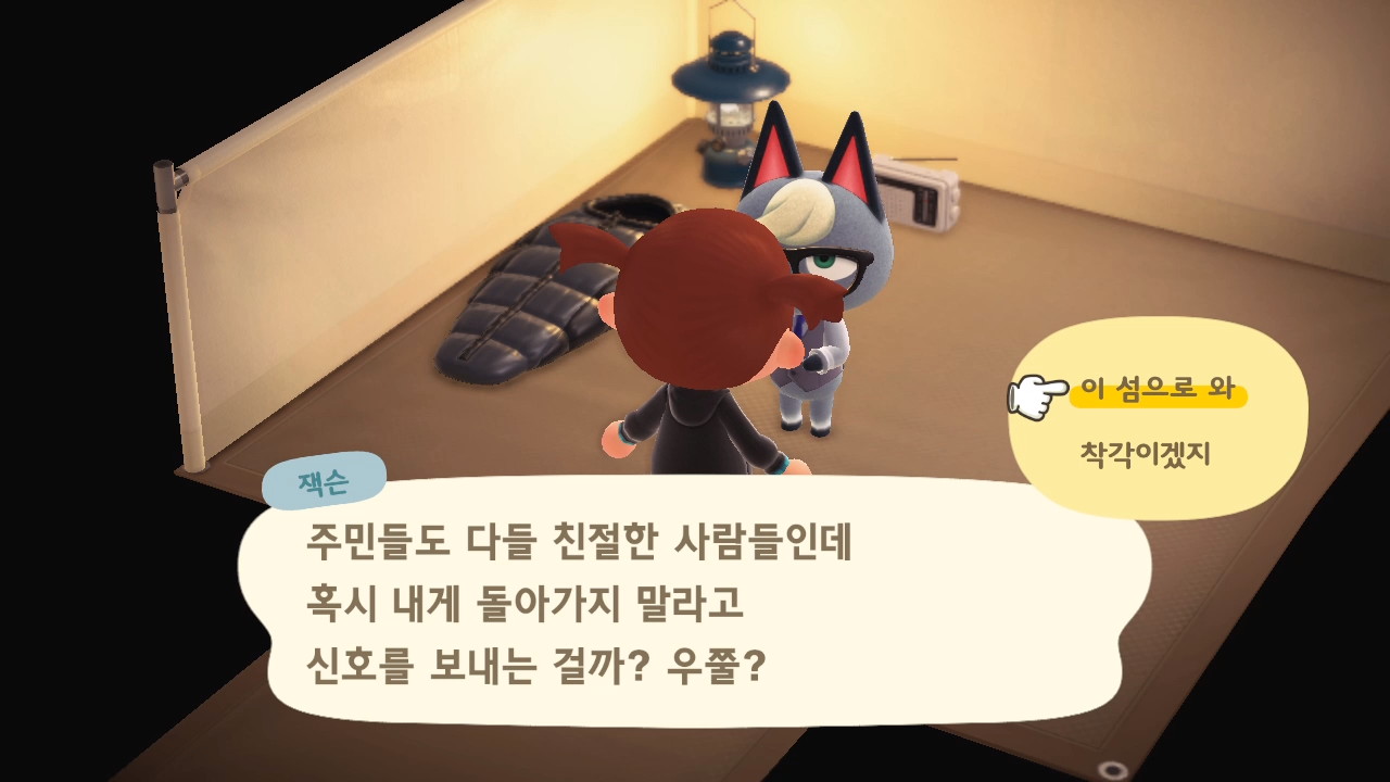 우리 섬에 있는 주민들 중 랜덤으로 한명의 이름을 거론하며, 그 아이를 내보내고 자기가 들어와도 될지 물어봅니다.